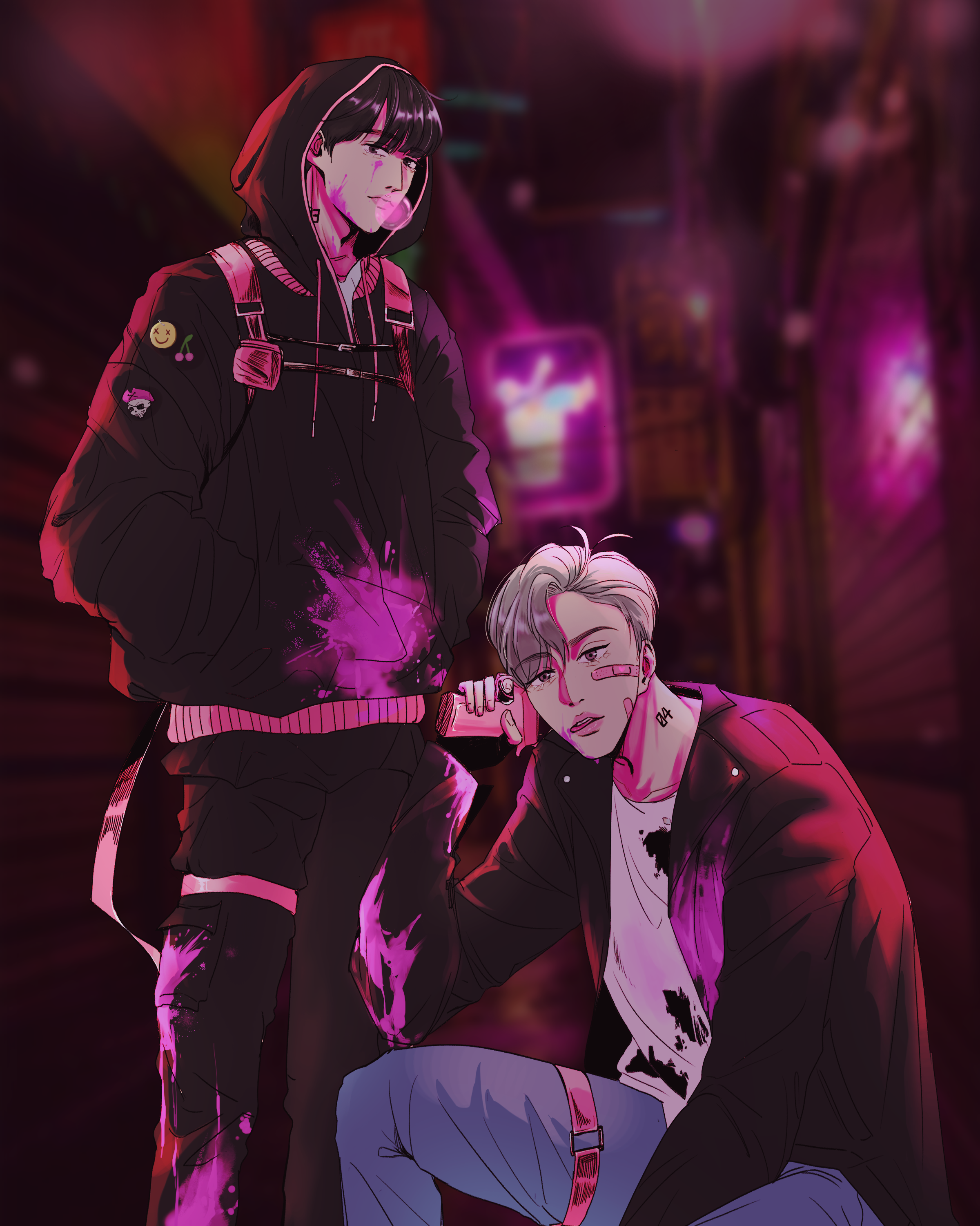 사이버펑크틱한 뒷골목 갱 윤섷이들은 아직 연성이 없던 것 같아서 후다닥 그렸는데 전 아직 한참 멀었네요...제가 원하는 그 너낌이 안나와서 살짝 슬픕니다 ㅜㅜ 킹치만 이런 윤섷도 그려볼 수 있음에 감사하는 중입니다 껄렁껄렁해 보이지만 하는 건 협박밖에 없는 섷와랑 그 뒤에서 묵묵히 있다가 시비걸리면 뚜까 패주는 윦너를 상상하면서 그리게 되더라구요..그리고 먹을거랑 돈 야금야금 모아서 살아갈 것 같은...? 여러분들은 어떤 스토리가 그려지셨는지 궁금하네여 천재티니들의 상상력에 맡기며..... 합작 주최진분도 참여진분들도 모두모두 수고하셨구 해피 섷른하시길 바랍니다!!!